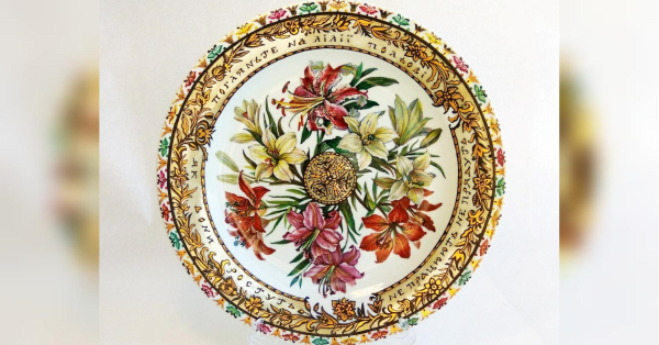 Краса ніжних пелюсток лілій передана майже фотореалістично. Яка палітра барв! Ми бачимо пелюстки різних відтінків — ніжного білого, світло-бузкового, лососево-брунатного й насиченого червоного. Периметр тарілки обрамлено широкою смугою витонченого золотого орнаменту, виконаного у стилі рококо із переплетенням квіткових мотивів, арабесок і барельєфних гірлянд. У самому центрі тарілки — круглий медальйон із позолоченим рослинним візерунком, ніби витесаним на камені. Зовнішній обідок прикрашений дрібними стилізованими квітками й листочками.